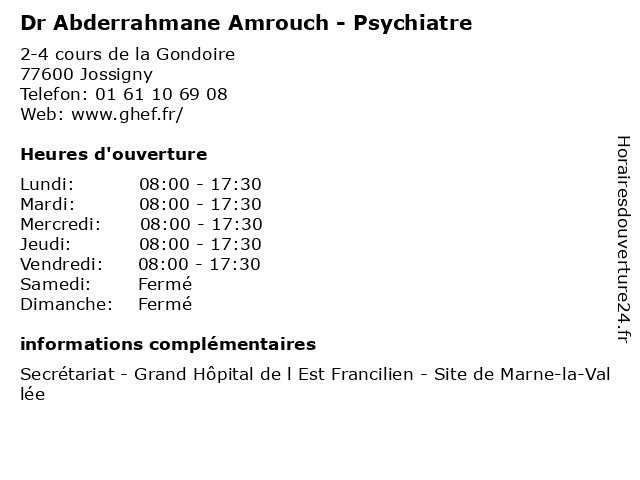 1 Dr Abderrahmane Ajjabou - Médecin généraliste (Distance: 0,00 km) 2-4 cours de la Gondoire, 77600 Jossigny abderrahmane, ajjabou, consultation, docteur, dr, généraliste, med, médecin, traitement 2 Dr Sofiane Merrouche - Psychiatre (Distance: 11,10 km) 77 Rue Marie Curie, 77177 Brou-sur-Chantereine dr, folie, merrouche, psychiatre, psychiatrie, psychiatrique, sofiane 3 Dr Belkacem Serisser - Psychiatre (Distance: 16,10 km) 206 Rue Pierre Brossolette, 93160 Noisy-le-Grand belkacem, consultation, dr, psychiatre, psychiatrie, psychothérapie, serisser 4 Dr Zine Eddine Chaa - Psychiatre - secrétariat (Distance: 17,24 km) 186 Avenue Jean Jaurès, 93370 Montfermeil chaa, dr, eddine, médecins, médicaments, psychiatre, santé, secrétariat, spécialiste, zine 5 Dr Zine Eddine Chaa - Psychiatre - secrétariat (Distance: 17,24 km) 186 Avenue Jean Jaurès, 93370 Montfermeil chaa, dr, eddine, médecins, médicaments, psychiatre, santé, secrétariat, spécialiste, zine 6 Dr Zine Eddine Chaa - Psychiatre - secrétariat (Distance: 17,24 km) 186 Avenue Jean Jaurès, 93370 Montfermeil chaa, dr, eddine, médecins, médicaments, psychiatre, santé, secrétariat, spécialiste, zine |