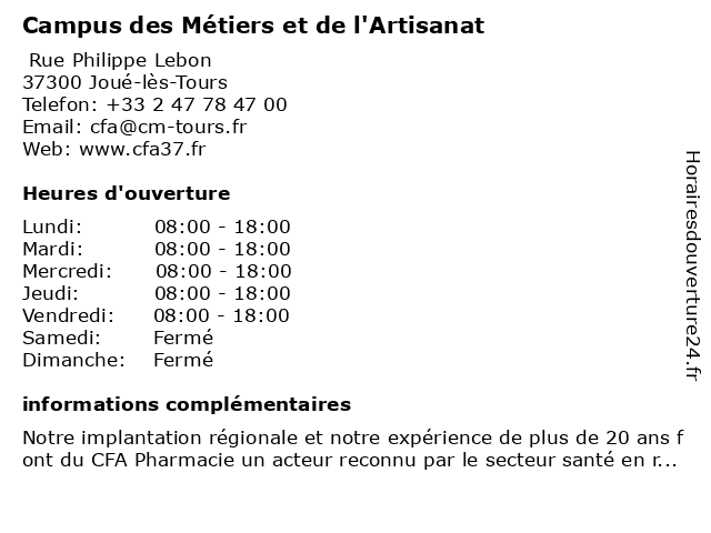 1 AMAP du Campus de Tours (Distance: 3,93 km) 35 avenue Ferdinand de Lessep, 37000 Tours alimentation, amap, campus, de, du, fruits, légumes, primeurs, producteur, tours, viandes 2 Radio Campus Tours (Distance: 4,08 km) 16 Allée Ferdinand de Lesseps, 37200 Tours campus, culture, musique, radio, tours, étudiante 3 Cardinal Campus - Résidence étudiante Campus Tours (Distance: 4,59 km) 49 Avenue de Bordeaux, 37300 Joué-les-Tours campus, cardinal, logement, résidence, student, tours, universitaire, étudiant, étudiante 4 Les Belles Années - Campus Parc (Distance: 4,66 km) 9 Avenue de l'Alouette, 37200 Tours années, belles, campus, les, logement, parc, résidence, student, universitaire, étudiant, étudiante 5 IPMS - Institut Professionnel des Métiers du Sport (Distance: 4,73 km) 238 rue Giraudeau, 37000 Tours des, du, institut, ipms, métiers, professionnel, sport 6 Chambre De Métiers Et De L'artisanat D' Indre Et Loire (Distance: 5,61 km) 36 Route de Saint-Avertin, 37200 Tours chambre, d', de, et, indre, l'artisanat, loire, métiers |