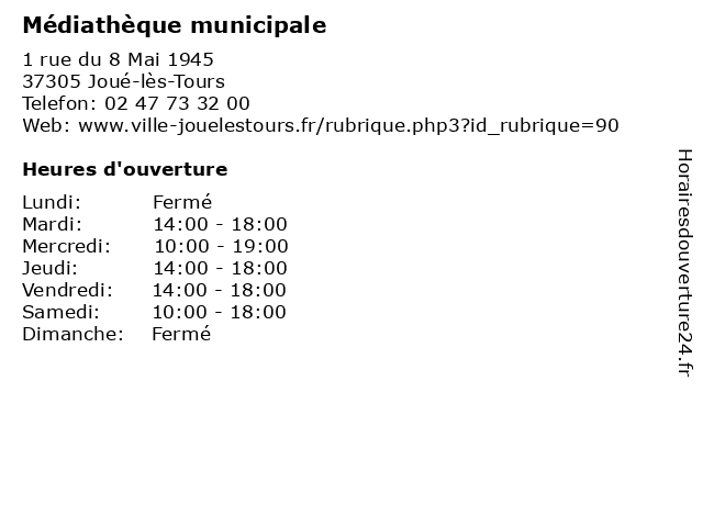 1 Médiathèque Municipale (Distance: 9,37 km) 3 Rue Léon Gambetta, 37230 Luynes activités, centre, culturel, de, luynes, municipale, médiathèque, Évènements 2 Médiathèque (Distance: 3,14 km) - Place de Võru, 37170 Chambray-lès-Tours cd, dvd, jeux videos, livres, médiathèque, revues 3 Médiathèque des Fontaines- Espace Adultes et Musique/Cinéma (Distance: 3,67 km) 11 rue de Saussure, 37200 Tours adultes, cd, d'été, des, dvd, espace, et, fontaines, hors, jeux videos, livres, musique/cinéma, médiathèque, période, revues 4 Médiathèque des Fontaines - Espace Jeunesse (Distance: 3,67 km) 11 rue de Saussure, 37200 Tours cd, des, dvd, espace, fontaines, hors, jeunesse, jeux videos, livres, médiathèque, revues, scolaires, vacances 5 Médiathèque (Distance: 4,61 km) . Place du Maréchal Leclerc, 37520 La Riche cd audio, cd.rom, livres, médiathèque, revues 6 Médiathèque (Distance: 5,86 km) 126 Rue de Cange, 37550 Saint-Avertin cd, dvd, jeux videos, livres, médiathèque, revues |
