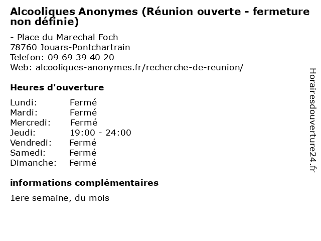 Termes de recherche pour Alcooliques Anonymes (Réunion ouverte - fermeture non définie):reunion, non, fermeture, ouverte, alcooliques, anonymes, définie |