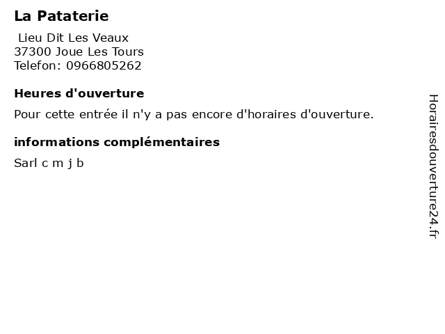 1 La Pataterie Restaurant (Distance: 1,17 km) 186 boulevard Jean Jaurès, 37300 Joue les Tours la, la nourriture, les boissons, pataterie, restaurant 2 La Pataterie Restaurant (Distance: 9,28 km) 15 rue Arthur Rimbaud, 37100 Tours la, la nourriture, les boissons, pataterie, restaurant |