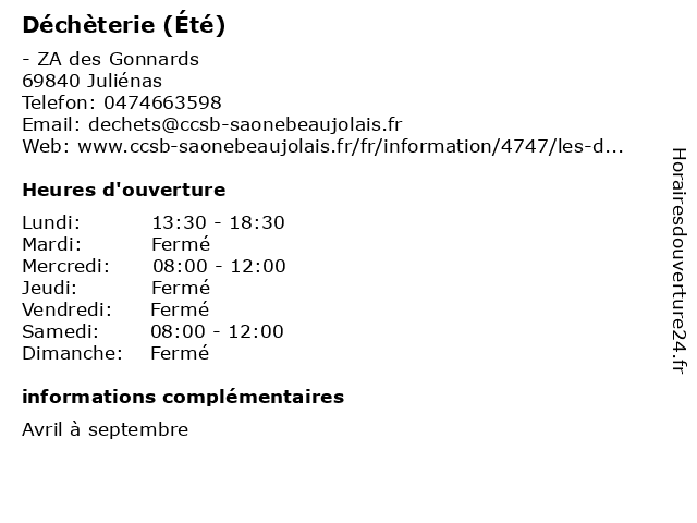 1 Déchèterie (Été) (Distance: 9,29 km) - ZA des Marcellins, 69910 Villié-Morgon bennes, déchets, déchèterie, détritus, gravats, été 2 Déchèterie (Été) (Distance: 11,86 km) - rue de l'Hôpital, 71520 Tramayes bennes, débarras, déchèterie, détritus, ordures, été 3 Déchèterie (Été) (Distance: 13,10 km) - Chemin de la Grisière, 71000 Mâcon bennes, débarras, déchèterie, détritus, ordures, été 4 Déchèterie (Été) (Distance: 13,95 km) - lieu-dit Les Dépôts, 69430 Saint-Didier-sur-Beaujeu bennes, déchets, déchèterie, détritus, gravats, été 5 Déchèterie (Été) (Distance: 14,28 km) - ZI de Pain Perdu, 69220 Belleville-en-Beaujolais bennes, déchets, déchèterie, détritus, gravats, été 6 Déchèterie (Été) (Distance: 16,40 km) - lieu-dit Moulin de Montravent, 71520 Trambly bennes, débarras, déchèterie, détritus, ordures, été |