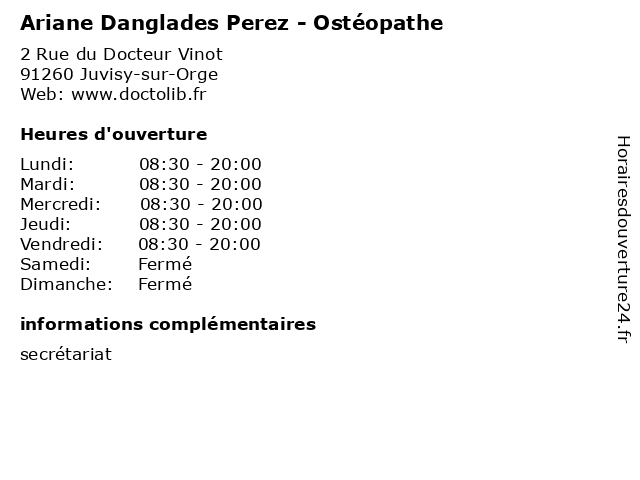1 Marine Perez - Sage-femme (Distance: 1,72 km) 4 Rue de l'Entente, 91200 Athis-Mons du, femme, marine, maternité, perez, périnée, rééducation, sage, uro-gynécologique 2 Ariane (Distance: 3,79 km) 11 Avenue Jean Mermoz, 91170 Viry Chatillon ariane, caregivers houses, child care, family home, home care, kindergartens, micro-nurseries, parental home 3 Ariane Bonifacino - Sage-femme (Distance: 6,18 km) 159 rue du Président François Mitterrand, 91160 Longjumeau ariane, bonifacino, consultation, docteur, femme, med, médecin, sage, traitement 5 Dr.Denis Perez- Cardiologie (Distance: 9,15 km) 31 Avenue de l'Abbaye, 91330 Yerres cardiologie, docteur, dr.denis, medecins, perez, sante 6 Dr Ariane Quesnot - Médecin spécialiste de santé publique (Distance: 11,58 km) 12-14 12 Avenue Paul Vaillant Couturier, 94800 Villejuif ariane, de, dr, médecin, médecins, médicaments, publique, quesnot, santé, secrétariat, spécialiste |