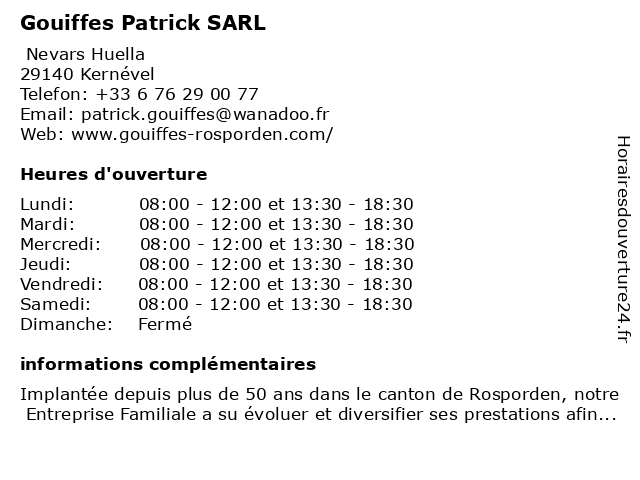 | Lundi | 08:00-12:00 et 13:30-18:30 |