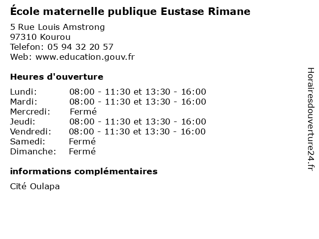 | 1 École élémentaire publique Eustase Rimane (Distance: 0,00 km) . Rue Louis Amstrong, 97310 Kourou cours, education, eustase, publique, rimane, services, École, école, élémentaire 2 École maternelle publique Léopold Héder (Distance: 0,60 km) . Rue Auguste Boudinot, 97300 Cayenne ecole, education, héder, léopold, maternelle, publique, services, école 3 Ecole Maternelle Publique - Kourou (Distance: 0,90 km) . Rue Cabalou, 97310 Kourou cours, ecole, kourou, maternelle, publique, services 4 Ecole Maternelle Publique- Saint-Nicolas-la-Chapelle (Distance: 34,31 km) . Montsinéry-Tonnegrande, 97356 Montsinéry-Tonnegrande chapelle, cours, ecole, la, maternelle, nicolas, publique, saint, services 5 Ecole Maternelle Publique - Macouria (Distance: 39,50 km) . Soula, 97355 Macouria cours, ecole, macouria, maternelle, publique, services 6 Groupe Maternelle Mortin Mortin - Cayenne (Distance: 45,38 km) . Route de la Madeleine, 97300 Cayenne cayenne, cours, groupe, maternelle, mortin, services |