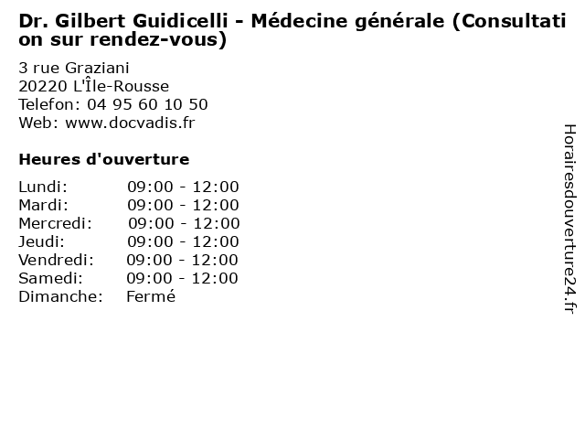 1 Dr. Gilbert Guidicelli - Médecine générale (Consultation libre) (Distance: nan km) 3 rue Graziani, 20220 L'Île-Rousse consultation, docteur, dr., gilbert, guidicelli, générale, libre, médecine, santé 2 Société Générale (Distance: 0,08 km) Avenue piccioni, 20220 L'Ile-Rousse association d'épargne et de crédit, atm, conseil en crédit, générale, organisme d'assurance auto, organisme d'assurance moto, organisme d'assurance-habitation, organisme d'assurance-vie, société 5 Le Rendez-Vous Des Cavaliers (Distance: 9,66 km) Sant Ambroggio, 20260 Lumio cavaliers, chiorboli, michel, rendez, restaurants 6 |