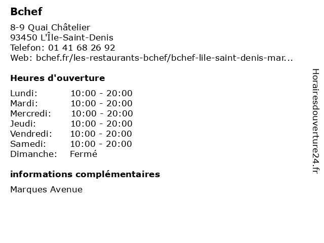 3 Bchef (Distance: 9,51 km) 30 Avenue des Champs Pierreux, 92000 Nanterre bagels, bchef, burgers, restaurant, restauration 4 Bchef (Distance: 12,67 km) - Place de la Vache Noire, 94110 Arcueil bagels, bchef, burgers, restaurant, restauration 5 Bchef (Distance: 12,75 km) 6 Passage Pierre Bézier, 92100 Boulogne Billancourt bchef, bistrot, menu, restaurant, salades 6 Bchef (Distance: 13,02 km) Bchef Modo Moisselles Domont, 95570 Moisselles bchef, dupresto, restaurants |