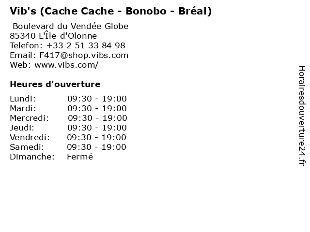 1 Vib's (Cache Cache - Bonobo - Bréal) (Distance: 0,43 km) 83 Boulevard du Vendée Globe, 85340 Les Sables-d'Olonne bonobo, bréal, cache, vib's 5 Cache Cache (Distance: 0,20 km) 15 Rue du Compagnonnage Le Champ du Moulin, 85340 Olonne-sur-Mer cache 6 |