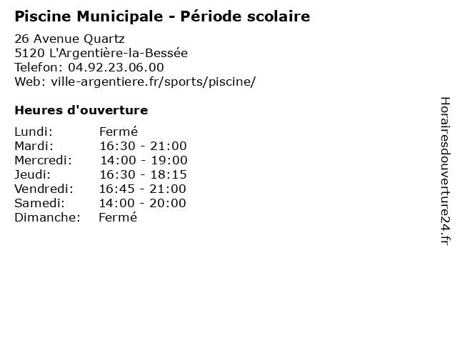 1 Piscine Municipale - Période scolaire (Distance: 13,26 km) 37 rue Bermond - Gonnet, 05100 Briançon aqua, aquatique, municipale, piscine, période, scolaire 2 Piscine Municipale - Petites Vacances (Distance: 0,00 km) 26 Avenue Quartz, 05120 L'Argentière-la-Bessée aqua, aquatique, municipale, petites, piscine, vacances 3 Piscine Municipale - Juillet et Août (Distance: 0,03 km) 26 Avenue Quartz, 05120 L'Argentière-la-Bessée 31, août, aqua, aquatique, au, du, et, juillet, l'été, municipale, piscine 4 Piscine Municipale - bassin extérieur (Juillet et Août) (Distance: 0,03 km) 26 Avenue Quartz, 05120 L'Argentière-la-Bessée 31, août, aqua, aquatique, au, bassin, du, et, extérieur, juillet, l'été, municipale, piscine 5 Aire municipale et Euro-Relais (Borne campings-car) (Distance: 7,03 km) - Clôt du Rouzel, 05290 Puy Saint Vincent aire, borne, camping, campings, car, eaux, et, euro, municipale, park, relais, service, stationnement, tourisme, vidange 6 Piscine Municipale Extérieure (Distance: 7,78 km) - Le Puy Saint-Vincent, 05290 Puy-Saint-Vincent aqua, aquatique, chauffée, extérieure, municipale, piscine |