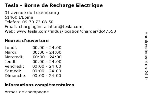 1 Tesla - Borne de Recharge Electrique (Distance: 7,92 km) 19 Place Monseigneur Tissier, 51000 Châlons en Champagne borne, de, electrique, recharge, tesla, électrique 2 YESSS Electrique Chalons En Champagne (Distance: 9,11 km) 6 Rue Charles Marie Ravel, 51520 Saint-Martin-sur-le-Pré appareillage, chalons, champagne, chauffage et climatisation, câbles, electrique, en, fils, gaines et conduits, installation, matériel électrique, outillage, sécurité, yesss, éclairage 3 Tesla Supercharcher - Bornes Electriques (Distance: 16,47 km) 8 Route Nationale, 51510 Matougues auto, bornes, chargeur, charging, electrique, electriques, station, supercharcher, tesla 4 Tesla Supercharcher - Bornes Electriques (Distance: 22,84 km) - A4 - Aire de Reims-Champagne-Nord, 51400 Les Petites-Loges auto, bornes, chargeur, charging, electrique, electriques, station, supercharcher, tesla 5 Tesla Supercharcher - Bornes Electriques (Distance: 22,86 km) - A4 - Aire de Reims-Champagne-Sud, 51400 Les Petites-Loges auto, bornes, chargeur, charging, electrique, electriques, station, supercharcher, tesla 6 Tesla Supercharcher - Bornes Electriques (Distance: 24,11 km) - A4, 51400 Les Petites-Loges auto, bornes, chargeur, charging, electrique, electriques, station, supercharcher, tesla |