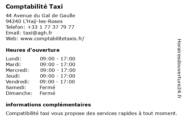 1 T.M.S Taxi Métrologie Service (Distance: 0,06 km) 50 Avenue du Gal de Gaulle, 94240 L'Haÿ-les-Roses métrologie, service, t.m.s, taxi 3 Station de Taxi (Distance: 2,34 km) 149 Avenue du Gal Leclerc, 92340 Bourg-la-Reine de, station, taxi, trajets, voyages 4 Taxi conventionné Seine et Marne (Distance: 2,44 km) 8 Allée Du Capitaine Dupont, 94260 Fresnes conventionné, et, marne, seine, service de limousine, service de transport, taxi 5 taxi conventionne lcb (Distance: 2,44 km) 8 Allée Du Capitaine Dupont, 94260 Fresnes conventionne, lcb, service de limousine, service de transport, taxi 6 Relais Colis® / ROYAL TAXI PHONE RETOUCHE (Distance: 3,00 km) 34 RUE DES MEUNIERS, 92220 BAGNEUX colis, colis®, phone, relais, retouche, royal, services postaux et de livraison, taxi |