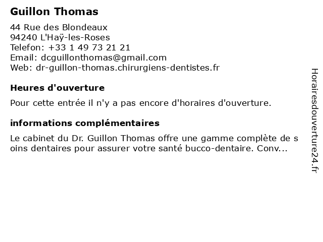 1 Dr Thomas Barbier - Chirurgien-dentiste (Distance: 3,54 km) 58 Rue Jean Longuet, 92290 Châtenay-Malabry barbier, chirurgien, dentaire, dentiste, dr, implantologie, parodontologie, thomas 2 Thomas Cook (Distance: 4,36 km) - Belle, 94511 Thiais agence, billet d'avion et hôtel pour votre club, cook, séjour, thomas, voyage 3 Thomas Cook (Distance: 6,06 km) 112 Avenue du General Leclerc, 75014 Paris agence, billet d'avion et hôtel pour votre club, cook, séjour, thomas, voyage 4 Thomas Soleilhavoup - Hypnothérapeute (Distance: 6,51 km) 4 bis Rue Thibaud, 75014 Paris hypnose, hypnotherapeute, hypnothérapeute, sante, soins, soleilhavoup, thomas 5 Thomas Grava - Ostéopathe (Distance: 6,63 km) 41 Rue Alfred Lebidon, 94600 Choisy-le-Roi grava, osteo, osteopathe, ostéopathe, sante, soins, thomas 6 Rollin Roth Le Gentil Thomas (Distance: 7,81 km) 11 b Rue Delambre, 75014 Paris gentil, restaurants, rollin, roth, thomas |