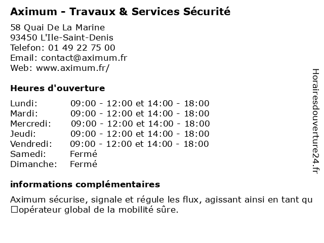 1 Aximum - Travaux & Services Sécurité (Distance: 17,31 km) Aéroport De Paris Base Vie Est, 95700 Roissy En France aximum, services, sécurité, travaux 2 Aximum Travaux - Génie Electrique et Systèmes (Distance: 0,05 km) 58 Quai De La Marine, 93450 L'Ile-Saint-Denis aximum, constructeur, electrique, entreprise générale de construction, et, génie, systèmes, travaux 3 Aximum Travaux (Distance: 1,66 km) 58 Quai de la Marine, 93450 L'ile-saint-denis aximum, construction, rénovation, travaux 4 Auto Sécurité (Distance: 2,85 km) 39 RUE PIERRE TIMBAUD, 92230 GENNEVILLIERS auto, automobiles, contrôle technique, motos, sécurité 5 Audit Conseil - Travaux d'Expertise Comptable (Distance: 4,96 km) 57 Rue de la Commune de Paris, 93300 Aubervilliers audit, comptabilité, comptable, conseil, d'expertise, expert-comptable, service, travaux 6 Avéo Home Staging et Travaux de l'Habitat (Distance: 7,24 km) 52 rue Hoche, 93500 Pantin avéo, de, et, home, l'habitat, staging, travaux |