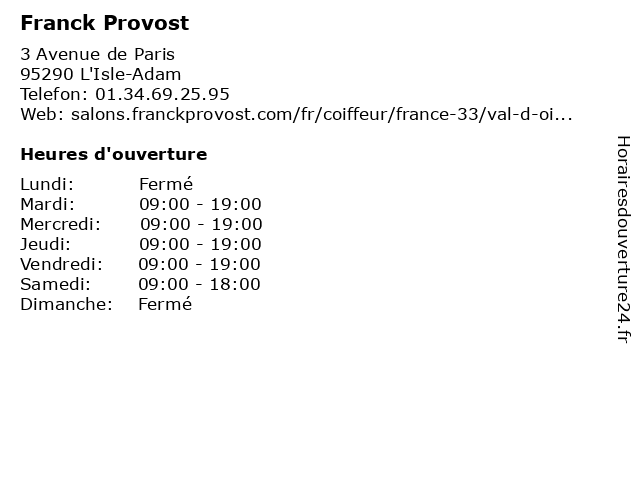 1 Franck Provost (Distance: 5,72 km) . Rue François Truffaut, 60230 Chambly beauté, cheveux, coiffure, franck, provost, salon, service 2 Franck Provost (Distance: 8,13 km) 1 Route Nationale, 95570 Moisselles beauté, cheveux, coiffure, franck, provost, salon, service 3 Franck Provost (Distance: 10,84 km) - Rue Théroigne de Méricourt, 95150 Taverny beauté, cheveux, coiffure, franck, provost, salon, service 4 Franck Provost (Distance: 10,87 km) 46 Chemin Des Hayettes, 95520 Osny coiffure, franck, provost, salon 5 Franck Provost (Distance: 12,85 km) - Rue de la Croix des Maheux, 95000 Cergy-Pontoise coiffure, franck, provost, salon 6 Franck Provost (Distance: 14,97 km) 5 Avenue Robert Schuman, 95350 Saint-Brice-sous-Forêt beauté, cheveux, coiffure, franck, provost, salon, service |
