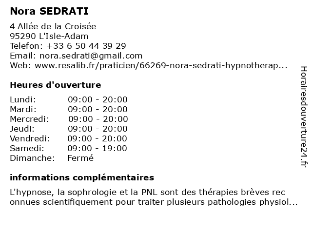 1 Nora Boucellami - Infirmière (Distance: 15,48 km) 46 Boulevard Charles de Gaulle, 95110 Sannois boucellami, infirmier, infirmiere, infirmière, nora, sante, soins 2 Nora Villemont Malherbe (Distance: 14,72 km) 29 Avenue de la République, 60270 Gouvieux malherbe, nora, villemont 3 Dr Nora Mignat - Médecin généraliste (Distance: 20,26 km) 26 Avenue de la République, 78500 Sartrouville docteur, dr, generaliste, généraliste, medecin, mignat, médecin, nora, soins 4 Nora Hadrami - Ostéopathe (Distance: 20,97 km) 7 Rue de Montesson, 95870 Bezons hadrami, nora, osteo, osteopathe, ostéopathe, sante, soins 5 Dr Nora Ousadou - Médecin généraliste - secrétariat (Distance: 20,71 km) 37 Rue du Haut de la Noue, 92390 Villeneuve-la-Garenne consultation, docteur, dr, généraliste, med, médecin, médecine, nora, ousadou, secrétariat, traitement 6 Dr Nora Oosadu - Médecin généraliste (Distance: 22,64 km) 17 Rue de Lorraine, 93200 Saint-Denis dr, généraliste, médecin, médecine, médical, nora, oosadu, pharmaceutique, traitement |