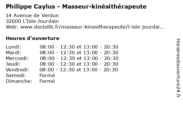 | Jeudi | 08:00-12:30 et 13:00-20:30 |