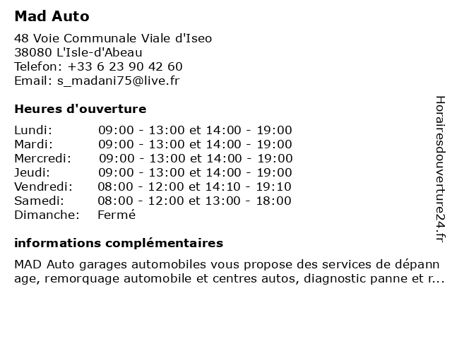 2 Mad Girl Créations (Distance: 30,70 km) 64 Chemin du Hameau de Barlet, 69560 Saint-Romain-en-Gal créations, girl, mad 3 Discothèque le Mad (Distance: 50,70 km) 265 Chemin du Parc, 69850 Saint-Martin-en-Haut discothèque, le, mad 4 Autoprimo - Mad Automobiles (Distance: 55,09 km) 25 rue de Pomaray, 73000 Sonnaz atelier, automobiles, autoprimo, carrosserie, entretien, garage, mad, reparation 6 Auto-École Idalpe Goo (Distance: 0,17 km) 83 Boulevard de Saint Hubert, 38080 L'Isle-d'Abeau auto, auto école, code, cours, formation, goo, idalpe, permis, école |