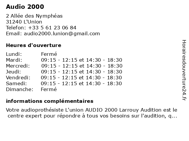 1 Opticien L'Union - Optic 2000 - 2, allée des Nymphéas (Distance: 0,01 km) 2 Allée des Nymphéas, 31240 L'Union 2000, allée, des, l'union, lentilles de contact, lunettes de soleil, lunettes de vue, nymphéas, optic, optic2000, opticien, opticien optic2000, ray-ban, rayban 3 Optic 2000 (Distance: 0,05 km) 2 Allée des Nymphéas, 31240 L'Union 2000, lunettes, optic, santé, solaires 4 Optic 2000 (Distance: 5,27 km) 7 Avenue Pierre Coupeau, 31130 Balma 2000, lunettes, optic, santé, solaires 5 Audioprothésiste Balma - Audio 2000 (Distance: 5,28 km) 7 Avenue Pierre Coupeau, 31130 Balma 2000, audio, audioprothésiste, balma 6 Audioprothésiste Toulouse - Audio 2000 (Distance: 5,29 km) 35 Avenue des Minimes, 31200 Toulouse 2000, audio, audioprothésiste, toulouse |