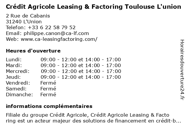 Termes de recherche pour Crédit Agricole Leasing & Factoring Toulouse L'union:l'union, toulouse, agricole, crédit, leasing, factoring |