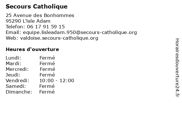 | 1 Secours Catholique (Distance: 5,48 km) 1 Rue Marcel Perrin, 95540 Méry-sur-Oise accueil, association, catholique, organisation, secours 2 Secours Catholique (Distance: 11,00 km) 24 Allée du Nivernais, 95310 Saint Ouen l'Aumône accueil, association, catholique, organisation, secours 3 Secours Catholique (Distance: 11,17 km) 1 Avenue des Diablots, 95280 Saint-Leu la Forêt accueil, association, catholique, organisation, secours 4 Secours Catholique (Distance: 11,62 km) 10 Rue des Maréchaux, 95800 Pontoise accueil, association, catholique, organisation, secours 5 Secours Catholique (Distance: 12,78 km) 2 Rue Maupassant, 95370 Montigny-lès-Cormeilles accueil, association, catholique, organisation, secours 6 Secours Catholique (Distance: 13,45 km) 1 Place du Commerce, 95610 Éragny accueil, association, catholique, organisation, secours |
