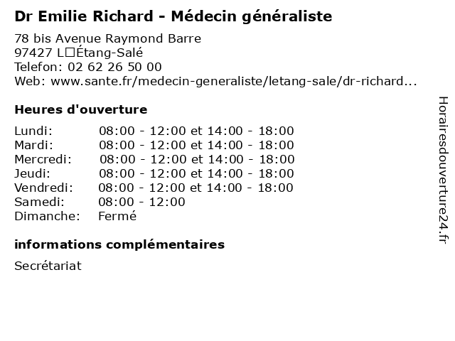 2 Dr Richard Magali - Pédiatre (Distance: 14,92 km) - Avenue François Mitterrand, 97448 Saint-Pierre chu, cilaos, de, dr, intensifs, joseph, la, le, louis, magali, neonatologie, néonatales, pierre, pédiatre, richard, réanimation, réunion, saint, sites, st 3 Dr Eliane Richard - Médecin généraliste (Distance: 28,08 km) 134 Rue Montrouge, 97460 Saint-Paul consultation, docteur, dr, eliane, généraliste, med, médecin, richard, traitement 4 Dr Richard Ramilison - Médecin généraliste (Distance: 41,62 km) - Chemin des Magnolias, 97490 Saint-Denis consultation, docteur, dr, généraliste, med, médecin, ramilison, richard, traitement 5 Aurélie Richard - Sage-femme (Distance: 41,88 km) - Allée des Topazes, 97400 Saint-Denis aurelie, aurélie, consultation, docteur, dr, femme, med, médecin, richard, sage, traitement 6 Ecole Elémentaire Publique Emilie Moreau - Saint-Benoît (Distance: 43,96 km) 37 Chem Beauvalon, 97470 Saint-Benoît benoît, ecole, education, elémentaire, emilie, maternelle, moreau, publique, saint, services |