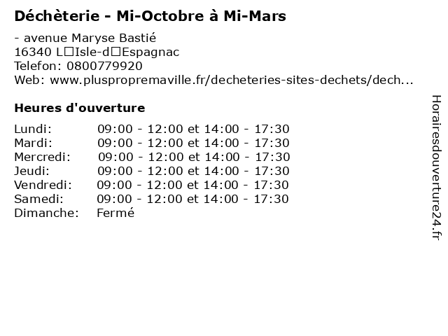 1 Déchèterie - Mi-Octobre à Mi-Mars (Distance: 3,22 km) 15 chemin de Bressour, 16800 Soyaux bennes, déchèterie, détritus, mars, mi, ménagers, octobre, ordures, poubelle 2 Déchèterie - Mi-Octobre à Mi-Mars (Distance: 3,35 km) - Route de Périgueux, 16410 Dirac bennes, déchèterie, détritus, mars, mi, ménagers, octobre, ordures, poubelle 3 Déchèterie - Mi-Octobre à Mi-Mars (Distance: 7,81 km) - La Grande Garenne, 16590 Brie bennes, déchèterie, détritus, mars, mi, ménagers, octobre, ordures, poubelle 4 Déchèterie - Mi-Octobre à Mi-Mars (Distance: 9,20 km) 97 route de Saint Michel, 16400 La Couronne bennes, déchèterie, détritus, mars, mi, ménagers, octobre, ordures, poubelle 5 Déchèterie - Mi-Mars à Mi-Octobre (Distance: 0,00 km) - avenue Maryse Bastié, 16340 L'Isle-d'Espagnac bennes, déchèterie, détritus, mars, mi, ménagers, octobre, ordures, poubelle 6 Déchèterie - Mi-Mars à Mi-Octobre (Distance: 3,22 km) 15 chemin de Bressour, 16800 Soyaux bennes, déchèterie, détritus, mars, mi, ménagers, octobre, ordures, poubelle |