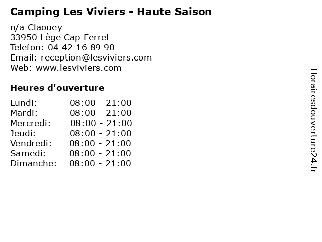 1 Camping Les embruns (Bar-Snack-Restaurant - haute saison) (Distance: 0,66 km) - Avenue Edouard Branly, 33950 Lège-Cap-Ferret bar, camping, embruns, haute, hebergement, les, restaurant, saison, snack, tourisme 2 Camping Les embruns (Réception haute saison) (Distance: 0,66 km) - Avenue Edouard Branly, 33950 Lège-Cap-Ferret camping, embruns, haute, hebergement, les, réception, saison, tourisme 3 Les Viviers (réception - Haute saison) (Distance: 3,75 km) - Claouey, 33950 Lège Cap Ferret camping, centre de vacances, haute, hébergements, les, location, réception, saison, tourisme, viviers 4 Camping Les Écureuils - Haute saison (Distance: 4,61 km) 1 rue des Oyats, 33740 Arès accueil, camping, en, haute, les, loisirs, saison, tourisme, vacances, Écureuils 5 Aire Park Réservation - Aire de services pour Camping-cars (Distance: 5,77 km) - Port Ostréicole, 33510 Andernos-les-Bains aire, arrêt, camping, camping car, cars, de, park, pour, repos, réservation, services, trajet, transports 6 Camping La Canadienne (Distance: 6,45 km) 82 avenue du Général de Gaulle, 33740 Arès accueil, camping, canadienne, la, loisirs, tourisme, vacances |