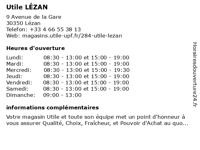 2 Utile Supermarché (Distance: 5,49 km) 2 route de Montpellier, 30350 Lédignan alimentation, epiceries, supermarché, supérette, utile 6 Utile Supermarché (Distance: 31,55 km) 38 Boulevard Gambetta, 30000 Nîmes alimentation, fruits, légumes, supermarché, supérette, utile, épicerie  |