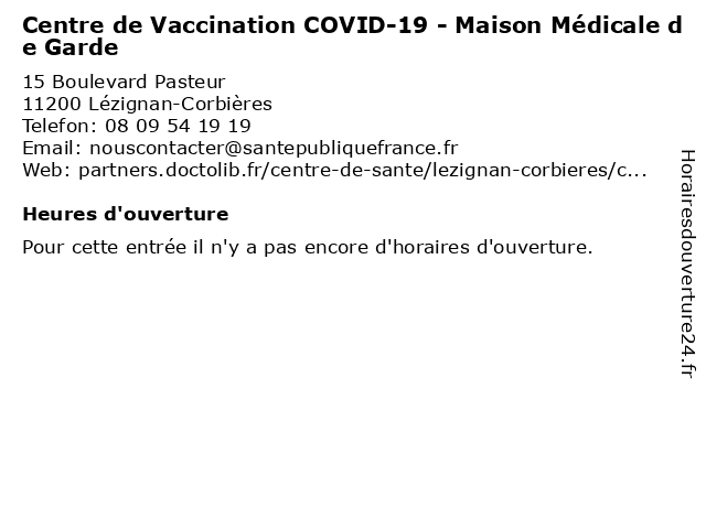 1 Centre de Vaccination COVID-19 - Caserne des Sapeurs Pompiers (Distance: 10,09 km) - Route d'Oupia, 34210 Olonzac 19, caserne, centre, covid, covid 19, covid19, de, des, médecin, médecine, médical, pompiers, sapeurs, test, vaccin, vaccination, vaccins 2 APEF Narbonne - Aide à domicile, Ménage, Jardinage et Garde d'enfants (Distance: 19,41 km) 32 Boulevard Maréchal Joffre, 11100 Narbonne aide, apef, d'enfants, domicile, et, garde, jardinage, ménage, narbonne 3 Centre de Vaccination COVID-19 - CH de Narbonne (Distance: 19,52 km) - Rue de l'Armée des Alpes, 11100 Narbonne 19, centre, ch, covid, covid 19, covid19, de, du, médecin, médecine, médical, narbonne, test, vaccin, vaccination, vaccins 4 Centre Hospitalier de Narbonne Imagerie Médicale (Distance: 19,61 km) - Boulevard Dr Lacroix, 11100 Narbonne centre, consultation, de, docteur, hospitalier, imagerie, med, médecin, médecine, médicale, narbonne, secrétariat, traitement 5 Dr Elisabeth Becker - Médecin généraliste (Distance: 0,63 km) 1 Place des Vosges, 11200 Lézignan-Corbières becker, consultation, dr, elisabeth, généraliste, médecin, vaccination 6 Dr Jean-Baptiste Boudet - Médecin généraliste (Distance: 0,63 km) 1 Place des Vosges, 11200 Lézignan-Corbières baptiste, boudet, consultation, dr, généraliste, jean, jean-baptiste, médecin, vaccination |