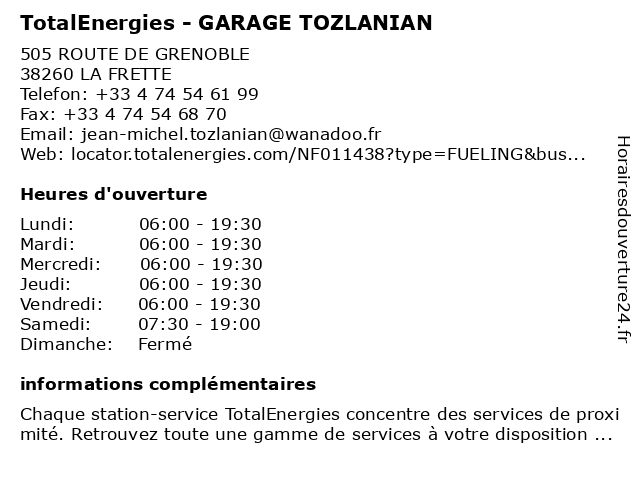 Termes de recherche pour TotalEnergies - GARAGE TOZLANIAN:garage, total, gas station, station service, tozlanian, tankstelle, totalenergies |
