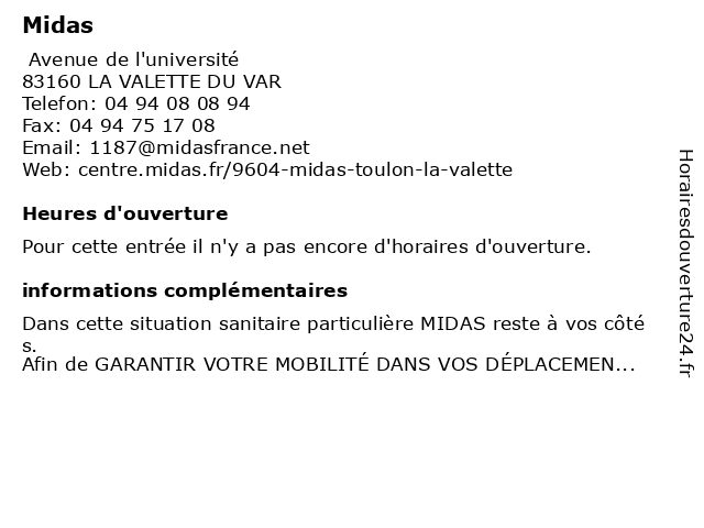 1 Midas Service (Distance: 0,23 km) . Avenue de l'Université, 83160 La Valette du Var entretien, midas, révisions, service, services d'automobiles, vidanges 2 Midas Le Pradet (Distance: 4,22 km) 23 Chemin la bayette za la bayette, 83220 LE PRADET atelier de réparation automobile, le, magasin de pièces automobiles, midas, pradet, service de climatisation automobile 3 Midas Hyères (Distance: 10,59 km) 6 Avenue de geoffroy, 83400 HYERES LES PALMIERS atelier de réparation automobile, hyères, magasin de pièces automobiles, midas, service de climatisation automobile 4 Midas La Seyne-sur-Mer (Distance: 11,39 km) Av. salvatore allende angle 39 rue louis martin bidouré, 83500 LA SEYNE SUR MER atelier de réparation automobile, la, magasin de pièces automobiles, mer, midas, service de climatisation automobile, seyne, sur 5 Midas (Distance: 37,19 km) 1085 Avenue des Paluds Provence Parc, 13400 AUBAGNE atelier de réparation automobile, magasin de pièces automobiles, midas, service de climatisation automobile 6 MIDAS service (Distance: 37,22 km) 1085 Avenue des Paluds, 13400 Aubagne entretien, midas, révisions, service, services d'automobiles, vidanges |