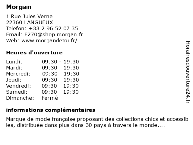 1 Morgan (Distance: 1,07 km) . Langueux RN12, 22360 Langueux beaute, cafe, chaussures, enfants, lingerie, mode femmes, mode hommes, morgan, restaurant, sport 2 Morgan (Distance: 1,54 km) . Rue Henri Becquerel, 22000 Rennes boutique, dames, mode, morgan, vêtements 3 Groupe Morgan Services (Distance: 2,30 km) 95 rue Gouedic, 22000 Saint Brieuc agence, emplois, groupe, intérim, morgan, offres, services 4 Cabinet d' Etiopathie GUEZENNEC VIRGINIE et CRESSENT MORGAN (Distance: 10,74 km) 2 Rue de l'Ic, 22590 Pordic cabinet, cressent, d', et, etiopathie, guezennec, morgan, virginie 5 OKAIDI ST BRIEUC LANGUEUX (Distance: 0,12 km) 1 Rue Jules Verne, 22360 Langueux brieuc, bébé garçon, chapeau bébé fille, chaussure bébé fille, chaussures fille, chaussures garçon, collant fille, dors bien, langueux, manteau bébé fille, manteau bébé garçon, manteau fille, manteau garçon, okaidi, pull fille, pyjama naissance, robe bébé, robe fille, sandale bébé garçon, st, tenue cérémonie garçon, vêtement bébé fille, vêtements fille, vêtements garçon 6 Vib's (Cache Cache - Bonobo - Bréal) (Distance: 0,33 km) Rue Fulgence Bienvenue, 22360 Langueux blazer femme, bonobo, boutique vêtement, bréal, cache, cardignan femme, chaussures femme, gilet femme, jean femme, jean homme, magasin vêtement, magasin vêtements mixte, manteau femme, manteau homme, mode femme, pull femme, pull homme, robe femme, sac femme, t-shirt femme, t-shirt homme, tailleur femme, top femme, vib's, vêtement femme, vêtement homme, vêtement mixte |