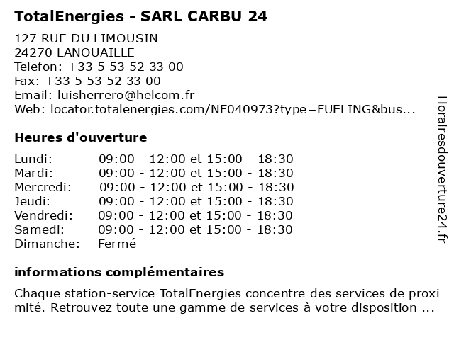 Termes de recherche pour TotalEnergies - SARL CARBU 24:sarl, total, 24, gas station, station service, carbu, tankstelle, totalenergies |