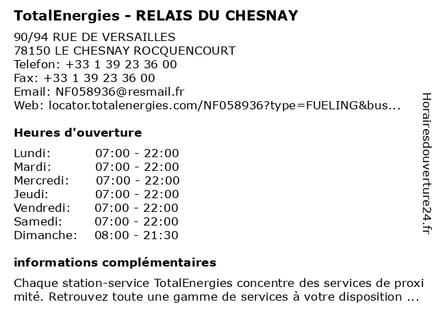 Termes de recherche pour TotalEnergies - RELAIS DU CHESNAY:relais, du, total, chesnay, gas station, station service, tankstelle, totalenergies |