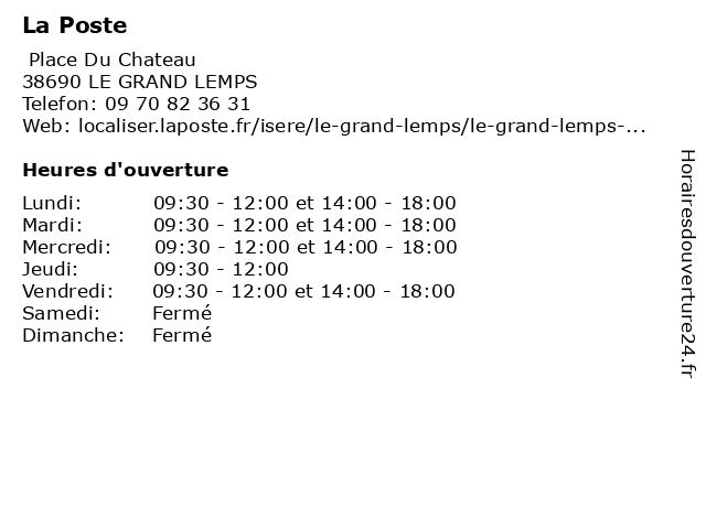 1 La Poste (Distance: 0,13 km) - Place du Château, 38690 Le Grand-Lemps agence, assurance, banque, banque postale, bureau de poste, chronopost, colis, courrier, dps, expéditions internationales, la, point, postale, poste, relais, timbres, téléphonie, ups, western union 2 La Poste (Distance: 0,55 km) - Place Joseph-Rossat, 38850 Chirens agence, colis, courriers, expédition, la, postale, poste, relais 3 La Poste (Distance: 2,38 km) 1365 Route du Tram, 38690 Colombe agence, colis, courriers, expédition, la, postale, poste, relais 4 La Poste (Distance: 6,04 km) 10 Rue de la Soierie, 38690 Longechenal agence, assurance, banque, banque postale, bureau de poste, chronopost, colis, courrier, dps, expéditions internationales, la, point, postale, poste, relais, timbres, téléphonie, ups, western union 5 La Poste (Distance: 6,18 km) 73 Route de Lyon, 38140 Apprieu agence, assurance, banque, banque postale, bureau de poste, chronopost, colis, courrier, dps, expéditions internationales, la, point, postale, poste, relais, timbres, téléphonie, ups, western union 6 La Poste (Distance: 10,53 km) 17 Rue du Vallon de Lamartine, 38730 Virieu-sur-Bourbre agence, assurance, banque, banque postale, bureau de poste, chronopost, colis, courrier, dps, expéditions internationales, la, point, postale, poste, relais, timbres, téléphonie, ups, western union  |