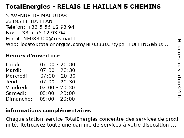 Termes de recherche pour TotalEnergies - RELAIS LE HAILLAN 5 CHEMINS:relais, le, haillan, total, chemins, gas station, station service, tankstelle, totalenergies |
