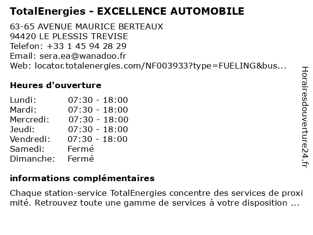 1 SERA Excellence Automobile (Distance: 0,02 km) 63 Avenue Maurice Berteaux, 94420 Le Plessis-Trévise automobile, excellence, sera 2 TotalEnergies - NOISY GD RICHARDETS G (Distance: 1,95 km) 33 AVENUE MEDERIC, 93160 NOISY LE GRAND gas station, gd, noisy, richardets, station service, tankstelle, total, totalenergies 3 TotalEnergies - RELAIS LA FOURCHETTE (Distance: 4,26 km) 247 AVENUE DU GENERAL DE GAULLE -, 94500 CHAMPIGNY SUR MARNE fourchette, gas station, la, relais, station service, tankstelle, total, totalenergies 4 TotalEnergies Station de recharge (Distance: 4,52 km) 12 N104, 77340 Pontault-Combault borne de recharge, borne de recharge autoroute, borne de recharge rapide, ccs, chademo, charge haute puissance, charge+, charging station, de, ev, high power charge, ma charge rapide, mobility, recharge, recharger ma voiture, recharger voiture, station, station autouroute, station de recharge, station-service, supercharger, tankstelle, total, totalaccess, totalenergie, totalenergies 5 TotalEnergies - GARAGE BRIE DES NATIONS (Distance: 5,01 km) 4-6 AVENUE PIERRE MENDES FRANCE, 77186 NOISIEL brie, des, garage, gas station, nations, station service, tankstelle, total, totalenergies 6 TotalEnergies Access - RELAIS DU MORBRAS (Distance: 5,66 km) 63/71 AV DU GENERAL LECLERC, 94370 SUCY EN BRIE access, du, gas station, morbras, relais, station service, tankstelle, total, totalenergies |