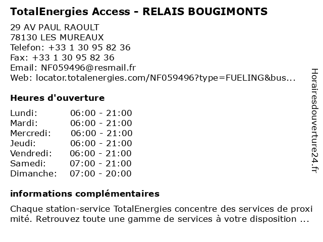 Termes de recherche pour TotalEnergies Access - RELAIS BOUGIMONTS:relais, access, total, gas station, station service, bougimonts, tankstelle, totalenergies |