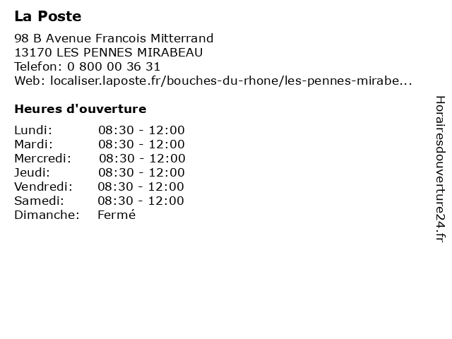2 La Poste (Distance: 9,34 km) - Avenue du Maréchal Leclerc de Hauteclocque, 13480 Cabriès agence, colis, courriers, expédition, la, postale, poste, relais 3 La Poste (Distance: 9,94 km) - Allée de la Poussaraque, 13180 Gignac-la-Nerthe agence, assurance, banque, banque postale, bureau de poste, chronopost, colis, courrier, dps, expéditions internationales, la, point, postale, poste, relais, timbres, téléphonie, ups, western union 4 La Poste (Distance: 11,82 km) 47 Avenue Camille Pelletan, 13127 Vitrolles agence, colis, courriers, expédition, la, postale, poste, relais 5 La Poste (Distance: 13,45 km) 1 Place jean moulin, 13320 Bouc bel air bouc bel air, la, la poste, poste 6 La Poste (Distance: 14,12 km) - Place Robert Lagier, 13290 Les Milles agence, assurance, banque, banque postale, bureau de poste, chronopost, colis, courrier, dps, expéditions internationales, la, point, postale, poste, relais, timbres, téléphonie, ups, western union |