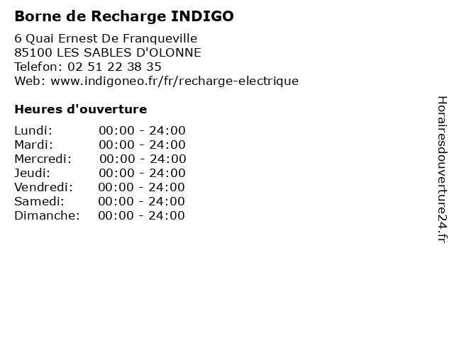 1 Borne de Recharge INDIGO (Distance: 0,36 km) 2 Rue De L'amiral Vaugiraud, 85100 Les Sables-d'Olonne borne, de, indigo, recharge 2 Parking Indigo (Distance: 0,00 km) 6-7 Quai Ernest de Franqueville, 85100 Les Sables-d'Olonne car, indigo, parking 5 Parking Indigo (Distance: 0,36 km) 2 rue de l'Amiral Vaugiraud, 85100 Les Sables-d'Olonne car, indigo, parking 6 Parking Indigo Les Sables-D'Olonne Centre Ville (Distance: 0,40 km) 2 Rue De L'amiral Vaugiraud, 85100 Les Sables-d'Olonne centre, d'olonne, indigo, les, parking, sables, ville |