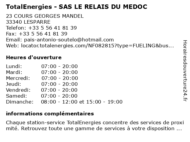 Termes de recherche pour TotalEnergies - SAS LE RELAIS DU MEDOC:relais, du, le, sas, medoc, total, gas station, station service, tankstelle, totalenergies |