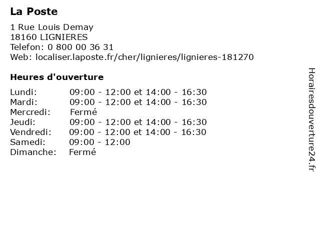 1 La Poste (Distance: 2,78 km) 10 Rue de Borneis, 18160 Saint-Hilaire-en-Lignières agence, assurance, banque, banque postale, bureau de poste, chronopost, colis, courrier, dps, expéditions internationales, la, point, postale, poste, relais, timbres, téléphonie, ups, western union 2 La Poste (Distance: 4,60 km) - Le Bourg, 18160 Saint-Baudel express chronopost, la, poste, réexpédition internationale 3 La Poste (Distance: 10,49 km) 1 Place de la Mairie, 36120 Pruniers agence, assurance, banque, banque postale, bureau de poste, chronopost, colis, courrier, dps, expéditions internationales, la, point, postale, poste, relais, timbres, téléphonie, ups, western union 4 La Poste (Distance: 13,44 km) 15 Rue de la Mairie, 36400 La Berthenoux agence postale, courrier postal, expédition internationale, la, poste 5 La Poste (Distance: 14,34 km) 46 Route de Saint Florent, 18290 Mareuil-sur-Arnon agence postale, expédition internationale, la, poste, service 6 La Poste (Distance: 15,14 km) 5 Place de l'Eglise, 36400 Thevet-Saint-Julien agence postale, courrier postal, expédition internationale, la, poste |
