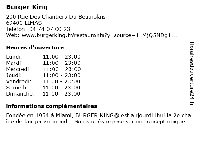 1 Burger King (Distance: 17,69 km) 2050 Route Nationale 6, 69760 Limonest bar & gril, burger, king, restaurant américain, restaurant de hamburgers, restaurant familial, restaurant à emporter 2 Burger King (Distance: 17,84 km) Aire D'autoroute A6 Sens Sud-nord, 69220 Taponas bar & gril, burger, king, restaurant américain, restaurant de hamburgers, restaurant familial, restaurant à emporter 3 Chicken King (Distance: 0,67 km) 136 Rue Antoine Arnaud, 69400 Villefranche-sur-Saône boisson, burger, chicken, fastfood, king, restaurant, restauration, tacos 4 Sofa King (Distance: 2,23 km) 81 Impasse Pelloutier, 69400 Villefranche-Sur-Saône ameublement, canapé, fauteuil, king, meubles, sofa 5 King Jouet (Distance: 2,24 km) 745 Avenue de l'Europe, 69400 Villefranche jeux, jouet, jouets, king, magasin, peluches 6 JMK Burger (Distance: 3,14 km) . Place du Marmont, 01480 Jassans-Riottier burger, fast food, jmk, restaurant, sandwichs, snack |