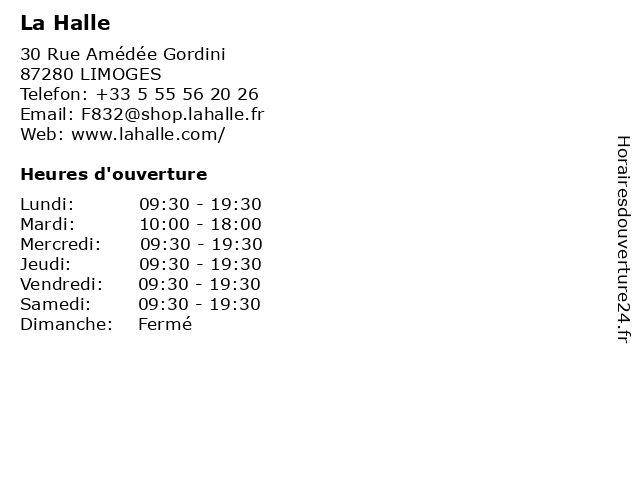1 La Halle (Distance: 12,92 km) Rue de la Tour, 87110 Le Vigen accessoires, bons plans, chaussures, chemise, halle, la, la halle, maroquinerie, mode bébé, mode enfant, mode femme, mode homme, pantalon, pas cher, petits prix, promotions, prêt à porter, pull, robe, t shirt, veste, vêtements 2 La Halle Chaussures (Distance: 0,13 km) 30 Rue Amedee Gordini, 87280 Limoges cafe, chaussures, enfants, halle, homme, la, mode femme, parfumeries, restaurant, servicies, sport 3 La Halle aux Chaussures (Distance: 1,89 km) . Beaubreuil, 87280 Limoges aux, centre, chaussures, commercial, coupole, halle, la, limoges 4 AGN Avocats Limoges Corner | La Halle de l'immobilier (Distance: 8,94 km) 310 Rue François Perrin, 87000 Limoges agn, avocats, corner, de, halle, l'immobilier, la, limoges 5 La Halle Aux Vins (Distance: 9,56 km) 53 Avenue du Général Martial Valin, 87000 Limoges aux, halle, la, vins 6 La Halle aux Chaussures (Distance: 12,92 km) - Lotissement La Tour II, 87110 Le Vigen aux, chaussure, chaussures, halle, la, maroquinerie, vetement |