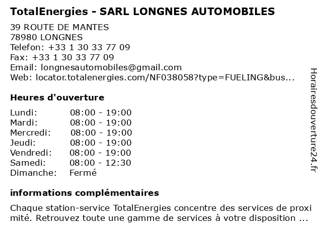 Termes de recherche pour TotalEnergies - SARL LONGNES AUTOMOBILES:automobiles, sarl, total, longnes, gas station, station service, tankstelle, totalenergies |