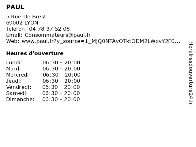 1 Paul (Distance: 0,33 km) 7 rue de la république, 69001 Lyon pains, patisserie, paul, traiteur, viennoiserie 3 Paul (Distance: 0,88 km) - Station de métro Lyon Bellecour, 69001 Lyon pains, patisserie, paul, traiteur, viennoiserie 4 Paul (Distance: 0,88 km) - Gare de Lyon-Part-Dieu, 69003 Lyon pains, patisserie, paul, traiteur, viennoiserie 5 Paul (Distance: 1,29 km) 14 rue des Remparts d'Ainay, 69002 Lyon pains, patisserie, paul, traiteur, viennoiserie 6  |
