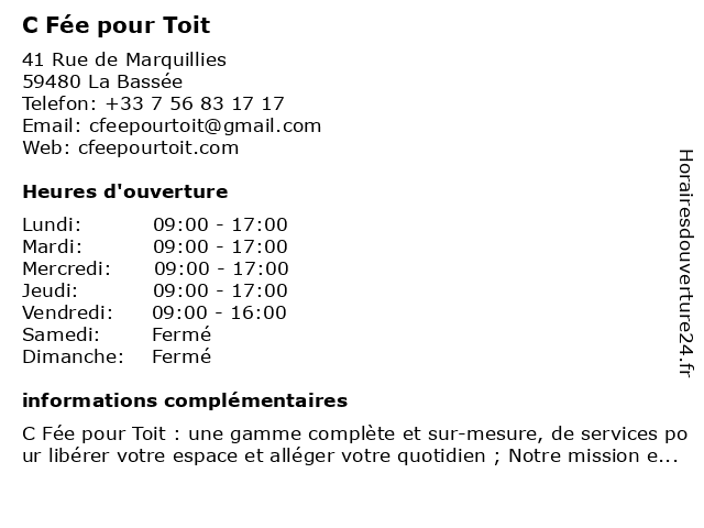 1 La Fée Maraboutée (Distance: 11,73 km) 17 rue de Paris, 62300 Lens accessoires, femme, fée, la, magasin, maraboutée, mode 2 La Fée Maraboutée (Distance: 12,82 km) 41 Rue du Pot d' Etain, 62400 Béthune accessoires, femme, fée, la, magasin, maraboutée, mode 3 Renov'Toit (Distance: 14,94 km) 37 rue Maurice Bouchery, 59113 Seclin bardage, couverture, isolation, renov'toit, toiture, zinguerie, étanchéité 4 La Fée Coquette (Distance: 15,29 km) 3 Rue Jacqueminemars, 59940 Estaires accessoires, boutique, coquette, fée, habillement, la, mode, vêtements 6 Destia - Sous Mon Toit (Distance: 16,87 km) 3A promenade de l’Abbé Pierre, 59160 Capinghem destia, domicile, mon, service, sous, toit |