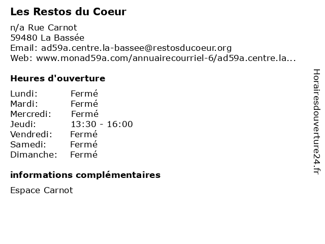 | 1 Les Restos du Coeur (Distance: 8,98 km) 4 Rue Jean Moulin, 59112 Annoeullin aide, aide alimentaire, coeur, dons, du, les, restos, solidarité, vente 2 Les Restos du Coeur (Distance: 10,50 km) - Rue du commandant Cousteau, 59251 Allennes Les Marais aide, aide alimentaire, coeur, dons, du, les, restos, solidarité, vente 3 Les Restos du Coeur (Distance: 14,74 km) - Avenue de Flöha, 62680 Mericourt aide, aide alimentaire, coeur, dons, du, les, restos, solidarité, vente 4 Les Restos du Coeur (Distance: 14,83 km) - Rue Courbet, 62210 Avion aide, coeur, dons, du, les, restos, solidarité, vente 5 Les Restos Du Coeur (Distance: 16,27 km) 79 Rue Thirion et Ferron,, 59320 Haubourdin aides, alimentaire, coeur, du, les, restos, santé, solidarité, soutien 6 Les Restos du Coeur (Distance: 16,32 km) n/a Rue Thirion et Ferron, 59120 Loos aide, aide alimentaire, coeur, dons, du, les, restos, solidarité |