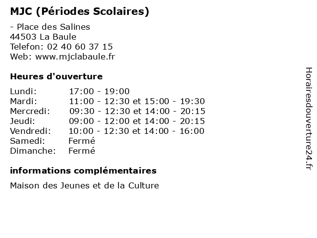 1 MJC (Vacances Scolaires) (Distance: 0,00 km) - Place des Salines, 44503 La Baule activités, centre, culture, culturel, de, des, et, jeunes, la, loisirs, maison, mjc, périodes, scolaires, vacances 2 Escape Yourself - Escape Game (Vacances scolaires) (Distance: 6,49 km) 29 bis avenue Villès Davaud, 44380 Pornichet amis, escape, famille, game, histoire, jeux, scolaires, sensations, vacances, yourself 3 Escape Yourself - Escape Game (Hors vacances scolaires) (Distance: 6,49 km) 29 bis avenue Villès Davaud, 44380 Pornichet amis, escape, famille, game, histoire, hors, jeux, scolaires, sensations, vacances, yourself 4 Point Information Jeunesse (Accueil ouvert pendant les vacances scolaires) (Distance: 7,05 km) 31 Avenue des Écoles, 44380 Pornichet accueil, administration, assoc, information, jeunesse, les, ouvert, pendant, point, scolaires, services, services publics, vacances 5 Laser Game Evolution (Vacances scolaires) (Distance: 9,23 km) 5 route de la Fontaine Tuaud, 44600 Saint Nazaire evolution, game, jeux, laser, scolaires, vacances 6 Centre Régional des œuvres Universitaires et Scolaires (Distance: 10,25 km) 60 Rue Michel-Ange, 44600 Saint-Nazaire administration, assoc, centre, des, et, régional, scolaires, services, services publics, universitaires, œuvres |