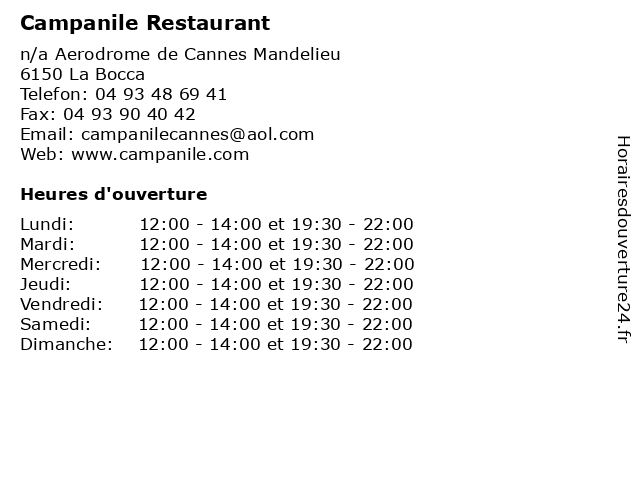 | Dimanche | 12:00-14:00 et 19:30-22:00 |